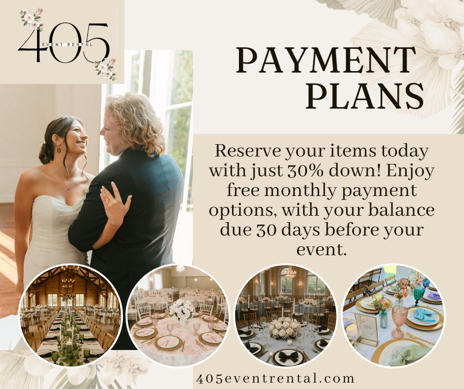 We know anything that has wedding in front of it comes with a big price tag. When we planned our daughter’s wedding, we were shocked at how expensive it was to buy items that were only used once. That’s why we created 405 Event Rental – to help couples enjoy beautiful decor without overspending. Our payment plans make it possible to design a stunning event while staying within your budget. Even with the savings from renting, weddings can still add up quickly. To ease the stress, we offer flexible payment options, so you don’t have to pay everything at once- especially when every other vendor is asking for their balance too.